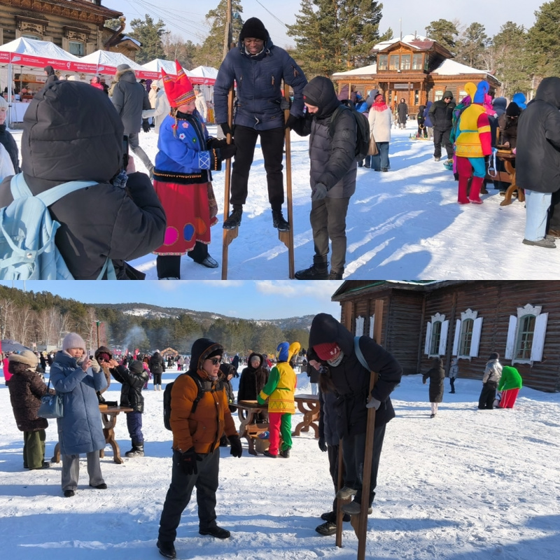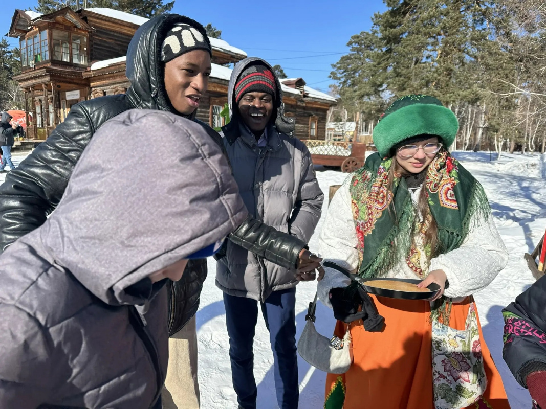 On February 22, 2026, a large, friendly group of international students, along with curators N.N. Alekseeva and B.V. Batueva, traveled on three buses to the traditional Maslenitsa festival.